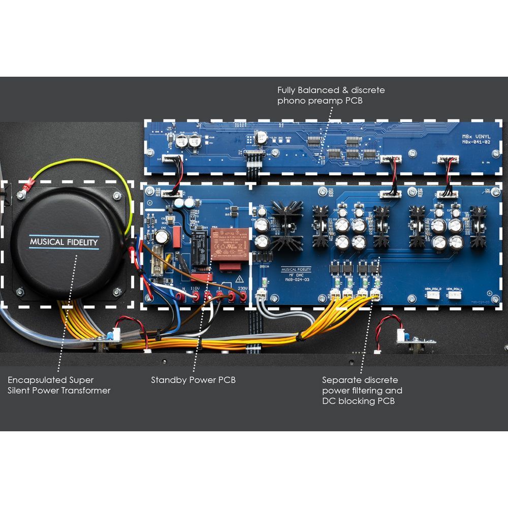 M8x Vinyl pokračuje ve vývoji transformátorů řady Super Silent Power. Průmyslové napájecí konektory s EMI filtrem a blokací DC složky eliminují rušení a brum transformátoru. Zapouzdřený toroidní transformátor je speciálně navržený pro práci s jemnými phono signály – má nízké jádrové nasycení a extrémně nízké elektromagnetické vyzařování. Každý diskrétní zesilovací stupeň je vybaven DC servem pro zajištění optimálního provozního režimu. Předzesilovač napájejí dva vysoce kvalitní, symetrické zdroje s nízkým rušením, každý pro jeden kanál – všechny pasivně filtrované a stabilizované.